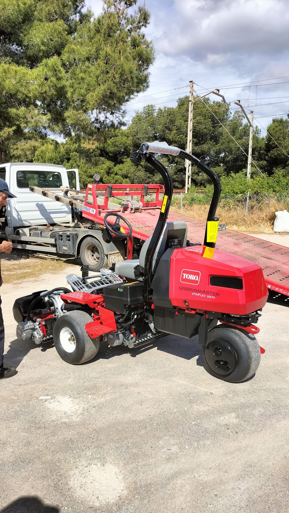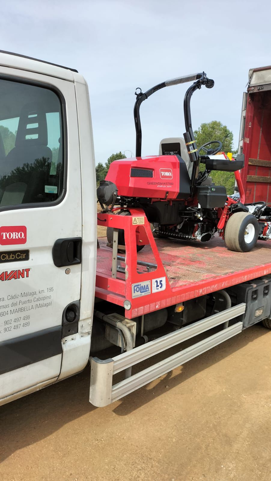 El tráiler amanece en las inmediaciones del club y la pluma que asistirá la descarga también ha llegado. Una vez el greenkeeper del campo o algún miembro de su equipo indican la zona donde depositar la o las máquinas, el mecánico de Riversa coordina la operación. La segadora de calles toca suelo. Ha llegado. Está lista para ser presentada y empezar a trabajar.